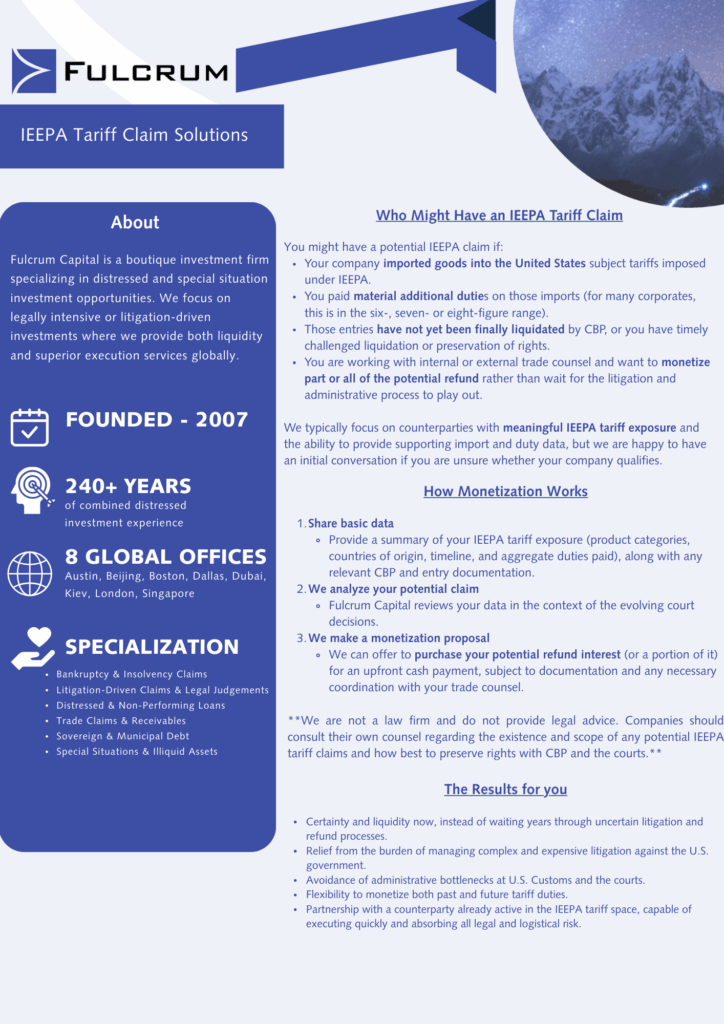 Get a quote / contact us if you are interested in selling your potential IEEPA tariff claim. Fulcrum Capital can provide you with the liquidity you need. We actively purchase interests in potential refund claims arising from tariffs imposed under IEEPA that are now being challenged in the courts.